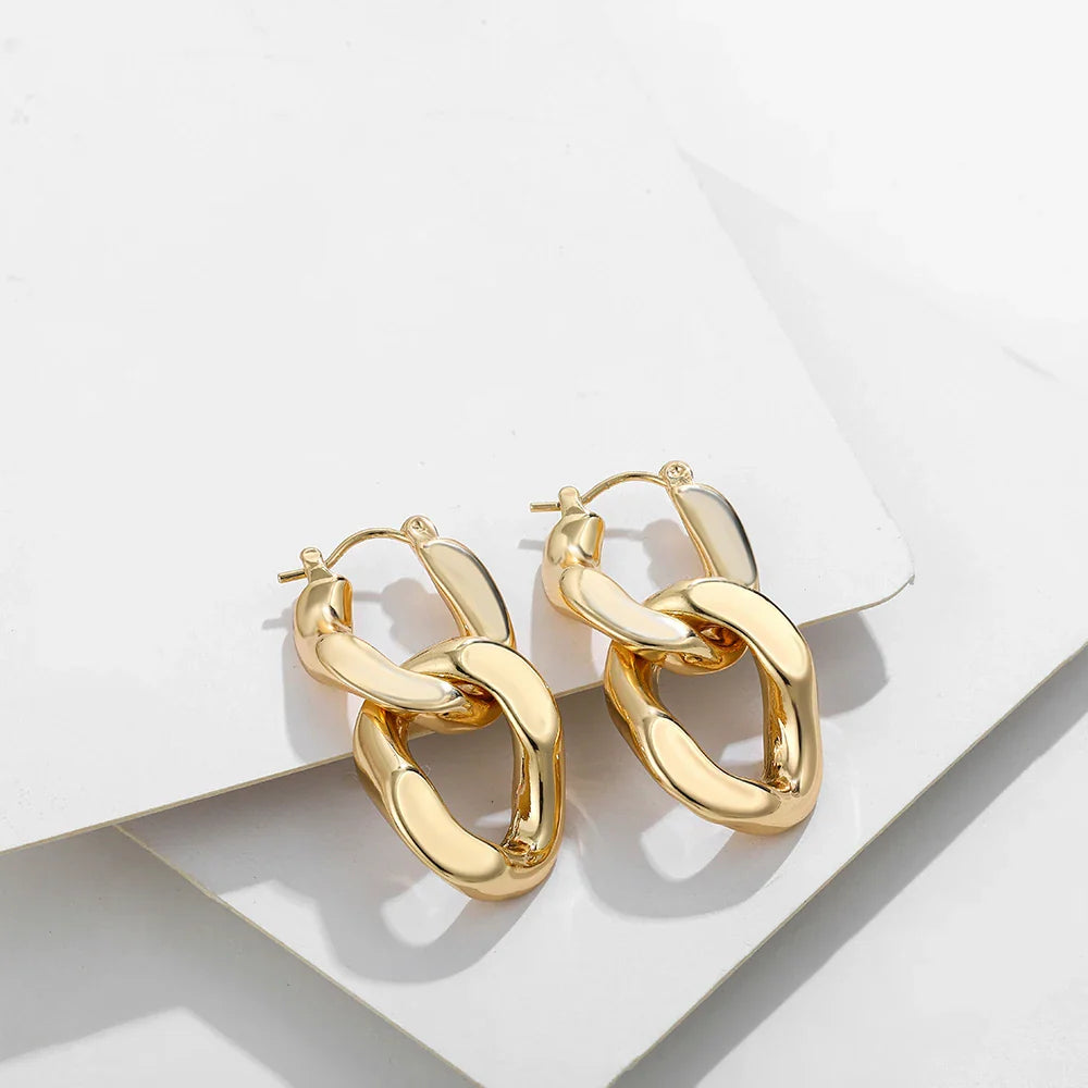 Die Gleura Link Ohrringe sind von kühner Schlichtheit geprägt und verleihen jedem Alltagslook einen modernen Charme. Mit ihrem klobigen, ineinandergreifenden Design und ihrer polierten Goldoberfläche setzen diese Ohrringe ein selbstbewusstes Statement, ohne schwer zu wirken.